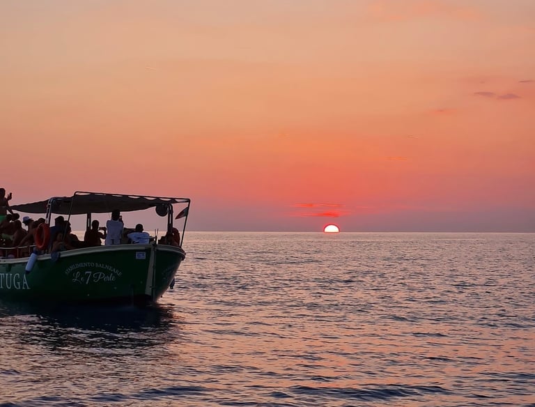 Vivi la magia del tramonto sulla Riviera dei Cedri con un’escursione dal fascino unico. Navigheremo lungo la splendida costa di Scalea fino a San Nicola Arcella, ammirando le sfumature dorate del sole che si riflettono sul mare, sulle scogliere e sull’inconfondibile Arco Magno, reso ancora più suggestivo dalla luce del crepuscolo. Un’esperienza rilassante e romantica, perfetta per chi desidera scoprire la costa in un’atmosfera diversa, avvolta dai colori del tramonto.